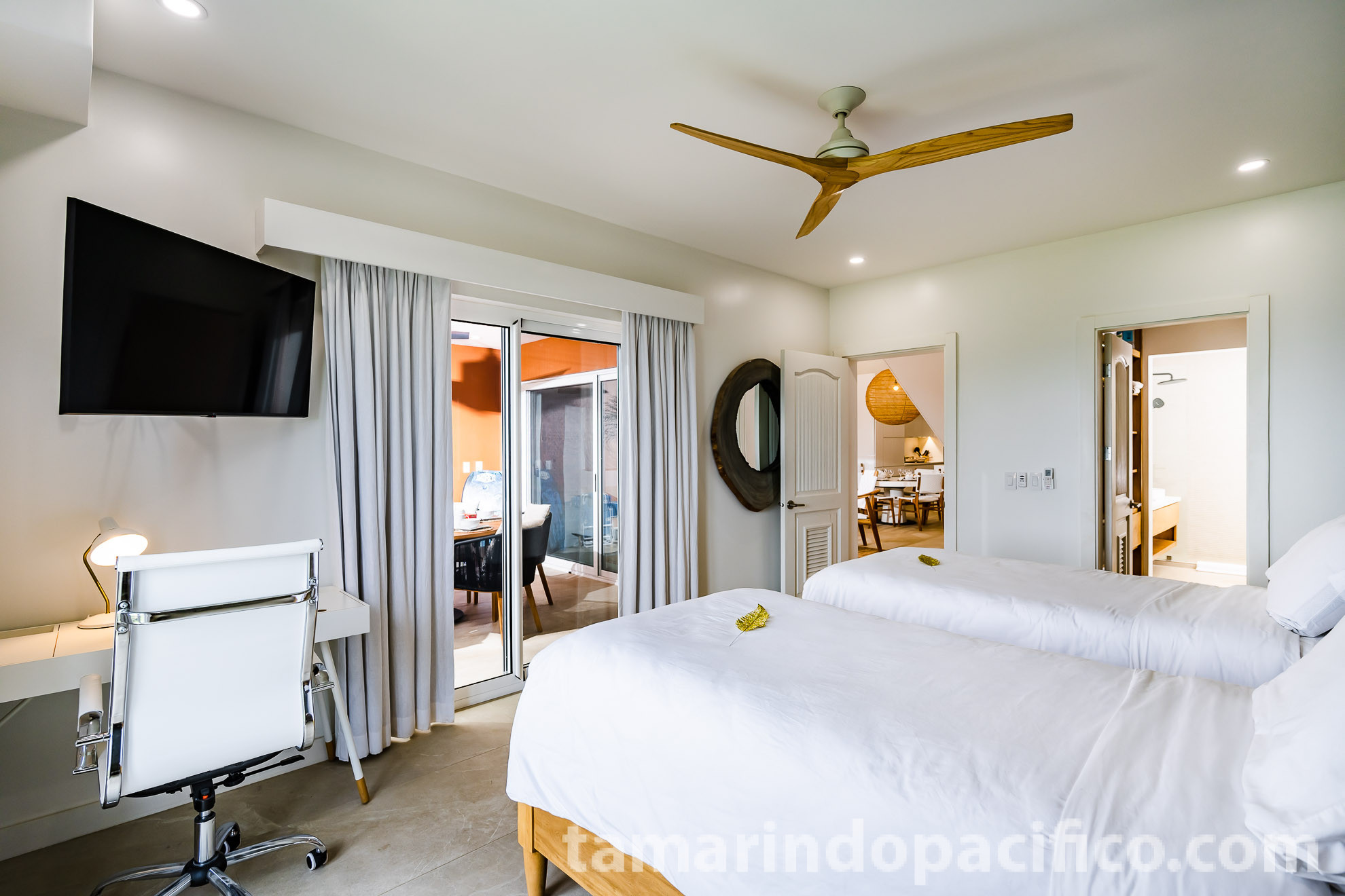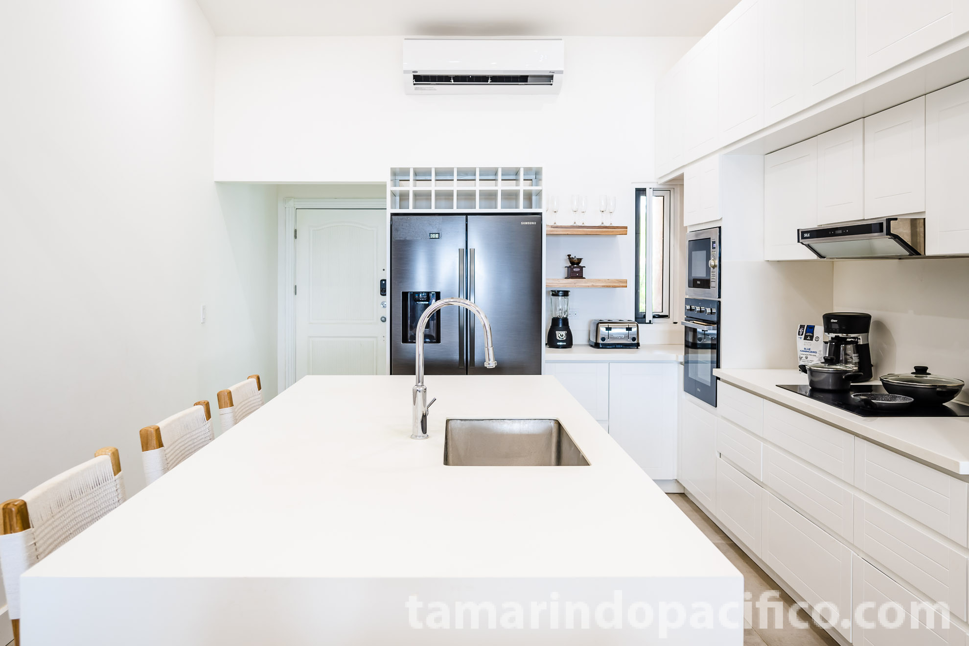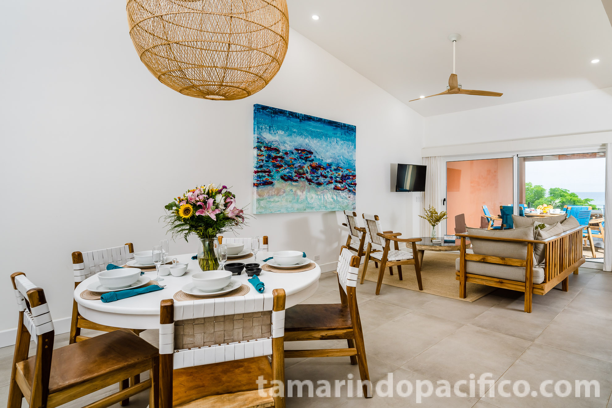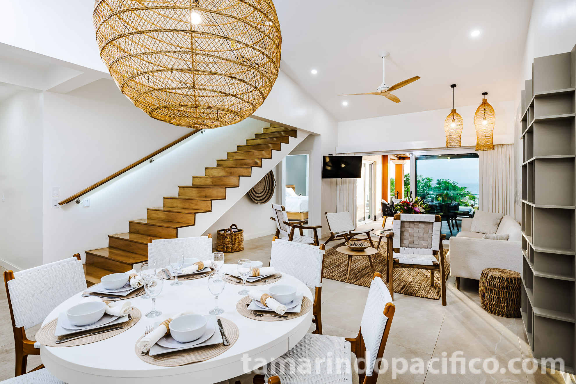 As you enter the main floor of the residence, you will face the large living area and kitchen with an ocean view. Grey floor tile and white, sleek kitchen cabinets are contrasted by natural teak furniture…